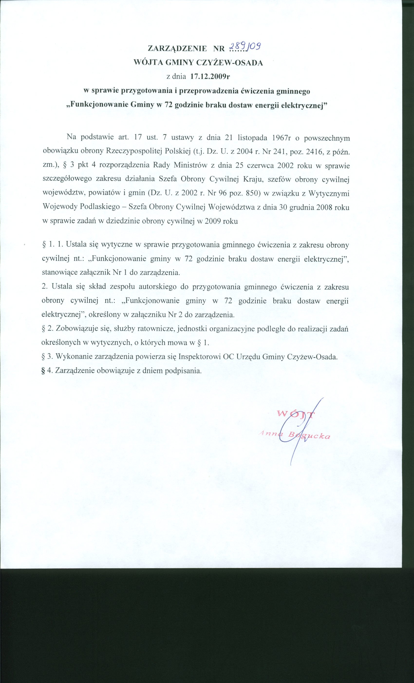 - nr 289/09 - w sprawie przygotowania i przeprowadzenia cwiczenia gminnego "Funkcjinowanie Gminy w 72 godzinie braku dostaw energii elektrycznej"